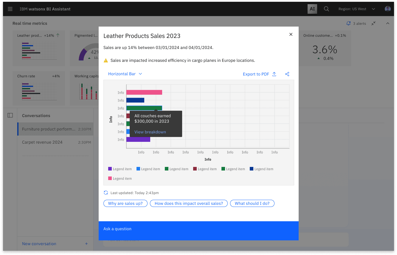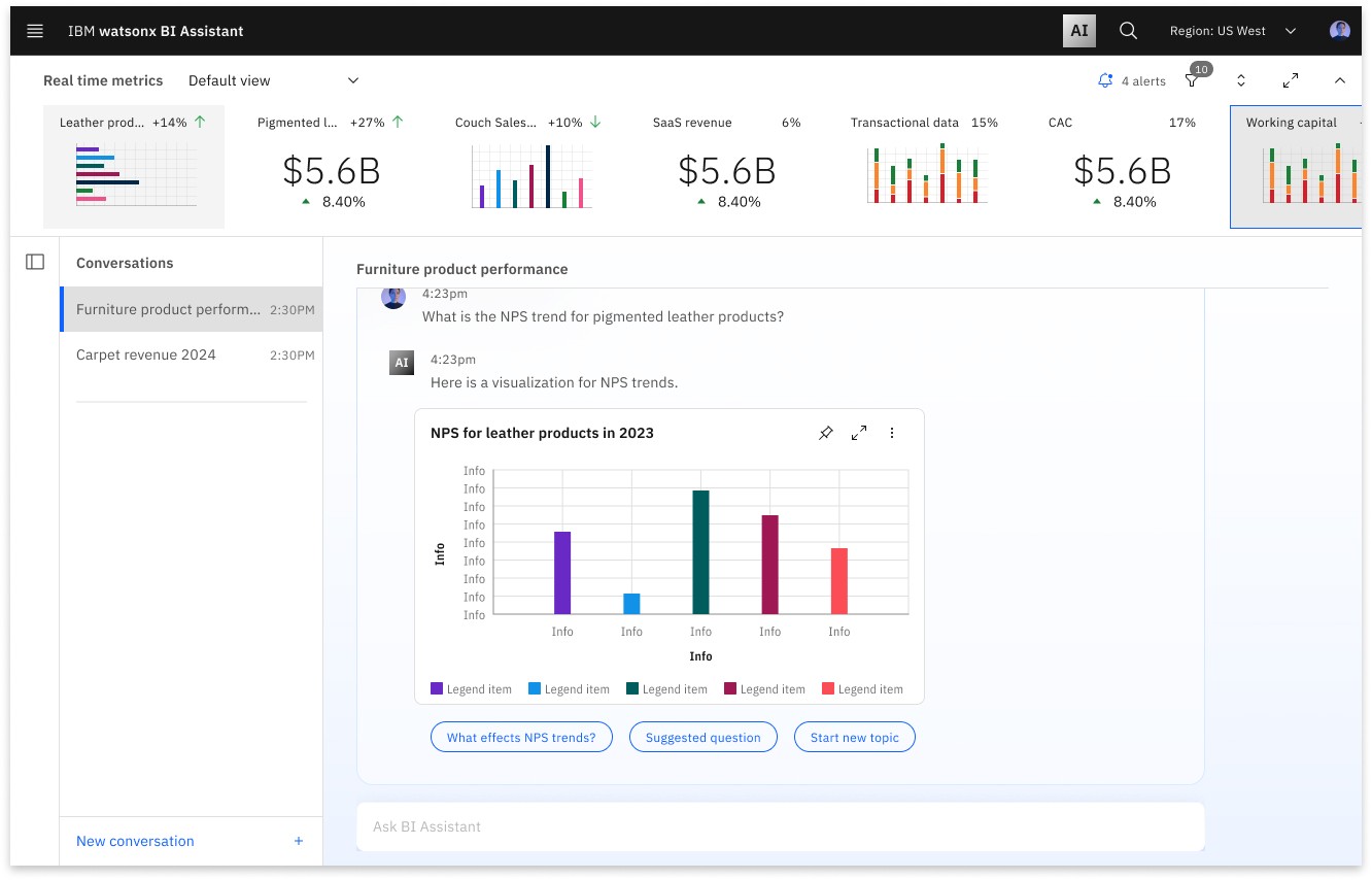 I led the end-to-end design strategy for IBM’s Watsonx BI. My role spanned vision-setting, product alignment, and execution, ensuring that design not only elevated the user experience but also directly advanced business objectives.