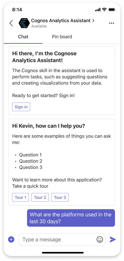 User research revealed a key pain point: customers needed faster access to Cognos data and an easy way to share insights outside the Cognos mobile app. In response, we designed a Teams plugin that enables users to ask questions about their Cognos data and receive answers directly within Microsoft Teams.
